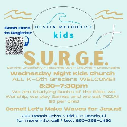 At Destin Methodist Kids, we POWER UP with prayer, POWER OUT to share God's love with each other and our community and POWER IN to charge our hearts and souls with God's word.